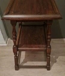 Beistelltisch aus holz. Von einer braun Farbe und stilvoll, stilvoll gründerzeit zusätzlich breite breit alles wie in einer Höhe von 77 cm; Von der Form quadratisch , einschließlich: säulentisch, istelltisch ¬