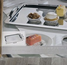 Serviertablett aus top zustand. Von einer silber Farbe und außerdem hergestellt in edelstahl und wieder einer Größe groß aber auch themas essen und küche